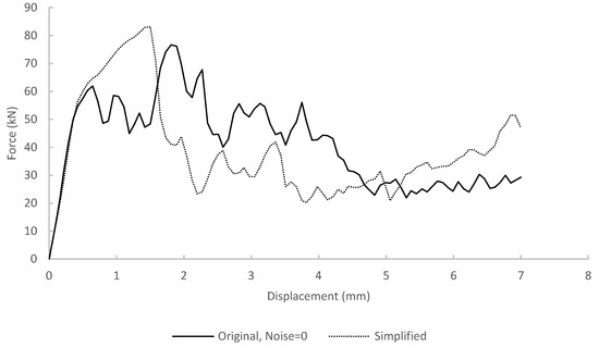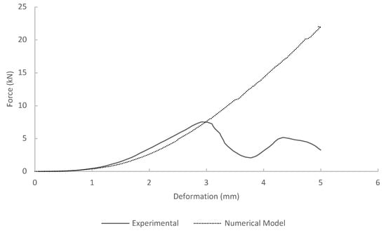 Based on reference Sahraei et al. [27], it is found that the short circuit will occur on this pouch battery when it is compressed at about . The goal of the numerical model is to recreate a similar force–displacement curve as the experimental result to the point of failure ( displacement). Figure 12 shows the force curve of the numerical result compared to the experimental result.