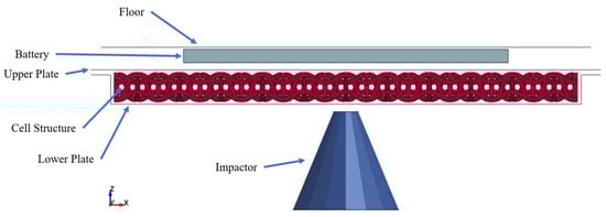 The general configuration of the battery system consists of (from top to bottom) the floor, battery, upper plate, cell structure, lower plate, and impactor. Figure 13 illustrates the general configuration of this model.