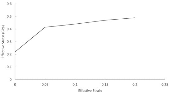 For the material properties, the modulus of elasticity for tensile loading is the maximum slope of the stress–volumetric strain curve . The tensile cut-off value is taken from the average tensile strength of the battery cell, which is . The Poisson’s ratio was assumed to be 0.01 due to the porosity of the battery’s cell. The density of the foam was assumed to be , which is calculated from the battery’s weight and volume . Table 10 and Figure 10 will display the material property of the battery’s foam.