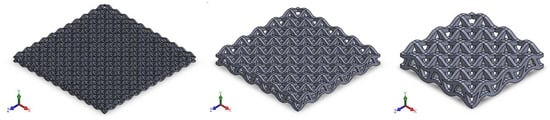 An auxetic structure is a type of meta structure where each cell structure has a negative Poisson’s ratio. This unique property means that this structure has several advantages, such as the ability to generate a curved surface mainly distributed by positive Gaussian curvature when subjected to out-of-plane bending (which is the direction of the load to the battery), improved resistance against shear deformation, improved indentation resistance at points where concentrated loads are applied, and a high quantity of energy absorption and damping, all while keeping its weight down [13,14,15].