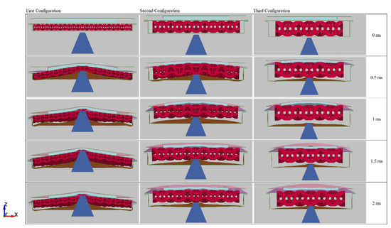 The first configuration is the only one that fails to protect the battery. The battery is deformed more than the deformation threshold for battery failure and even becomes punctured in some parts. This means that both the second and third configurations pass the first requirement. The dimension and mass of the structure are compared to choose between the second and third configuration.