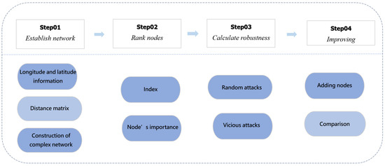 In this paper, we use the robustness of the network to analyze the layout of urban NEV charging stations. The procedure for evaluating robustness is proposed and presented in Figure 1, it involves the following steps: establish a network; classify nodes according to their importance; calculate robustness; improve robustness. More precisely, the data for the first stage are based on the mobile client named Chongdianba. Moreover, the data only include open charging stations in urban areas, excluding private charging stations and suburban charging stations. In the first step, the key procedure involves processing the location of charging stations and calculating the distance between charging stations. The third stage: robustness is calculated based on the degradation of network performance. In the final stage, a virtual network was built to test whether its robustness was reinforced.