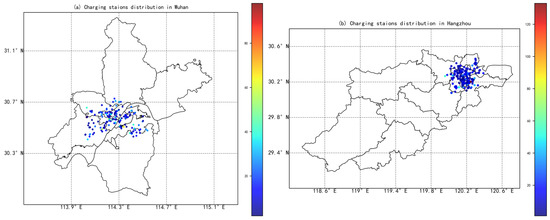 Distribution of NEV charging stations in urban areas. (a) Distribution of NEV charging stations in urban areas of Wuhan. (b) Distribution of NEV charging stations in urban areas of Hangzhou.