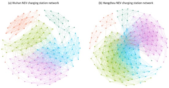 NEV charging station network in urban areas. (a) WNSN. (b) HNSN. The colors of the node indicate different communities.