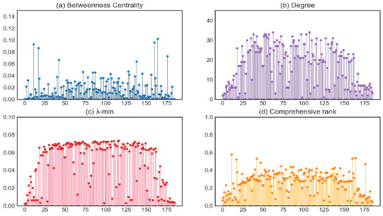 Ranking of key station nodes in HNSN. (a) The betweenness centrality of the station nodes. (b) The degree of the station nodes in HNSN. (c) The minimum eigenvalues of the deleted Laplacian matrix after removing the station nodes. (d) The comprehensive scores of the station nodes.