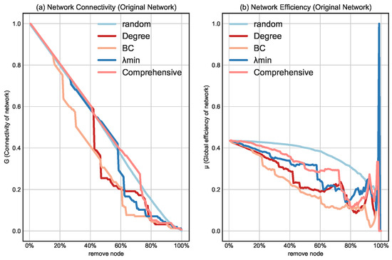 Random attack and malicious attack effect in HNSN. (a) The change in original network connectivity after deleting nodes in sequence according to the 5 methods. (b) The change in original network efficiency after deleting nodes in sequence according to the 5 methods.