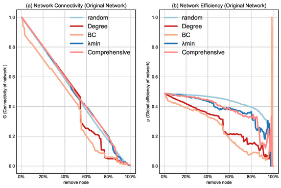 Given an order of node attacks on a network with n nodes, the robustness value of the network is defined as Equation (5). In a complex network, the network consisting of mutually accessible nodes is called a connected subgraph, and the one with the highest number of nodes is called the maximum connected subgraph of the network. The connectivity is the ratio between the number of nodes in the maximum connected subgraph and the total number of nodes in the network. If the maximum connectivity ratio of a network is 1, it means that all nodes of the network are reachable by each other.
