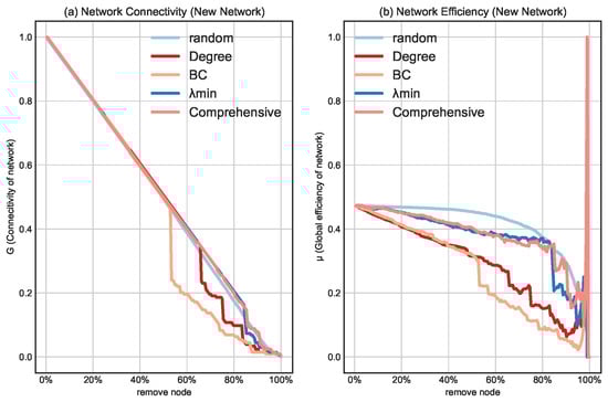 We also executed the above five attack strategies on the built virtual HNSN by adding new station nodes. The robustness curves of the virtue HNSN are shown in Figure 7. Comparing Figure 6 and Figure 7, we can find that the robustness of HNSN to external attacks can be enhanced by adding new station nodes. When the proportion of the attacked nodes is less than 40%, there is little difference between malicious and random attacks in reducing the connectivity of the network. That is to say, when the proportion of attacked nodes is less than 40%, under the most malicious attacking method of betweenness centrality, the virtual HNSN will slow down the rate of network connectivity decline. This means the approach of adding new station nodes can improve the connectivity of the original network. Comparing Figure 6 and Figure 7, it can be seen that when 40% of the nodes in the network are attacked, the efficiency of the original network drops to around 0.2, while in the virtual network, the efficiency of the network drops to about 0.25, so the robustness of the network is improved. Even with the increase in nodes, the comprehensive attack strategy still has the worst attack effect.
