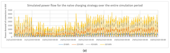 where the equation is almost identical to the one used in Section 3.1.2, with the additional condition that the sum of the charging station power across all connectors for all 1921 h observed in this dataset may not exceed a defined peak power, Pmax. The criterion is, however, a weak condition and may be violated in specific hours if no solution is otherwise found.