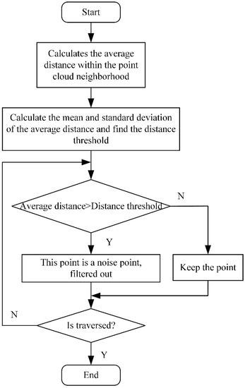 The filtering process of the statistical filter is given in Figure 1. First, the distance from each point to its nearest neighbor is calculated and the average is obtained. Then, assuming that the obtained results follow a Gaussian distribution, the distance threshold is computed by calculating its mean and standard deviation through the Gaussian function. Finally, the average distance and distance threshold of all points are traversed, and the relationship between them is compared to determine whether the point is a noisy point.