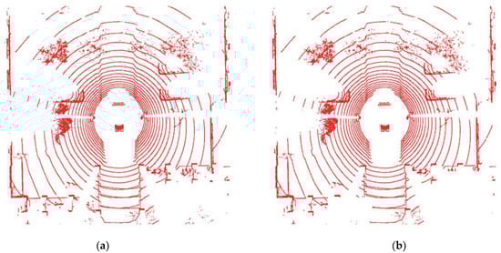 Take a frame of point cloud data as an example and apply the statistical filter to filter out the noise points. A frame of the original point cloud is shown in Figure 2a. There are many discrete noise points in the original point cloud data, and they are mostly distributed in the outer part of the scanning range of the radar. After using the noise-point-removal algorithm designed in this study, an optimized point cloud image shown in Figure 2b is obtained. The results show that the designed algorithm based on a statistical filter can effectively remove the discrete noise points in the distance.