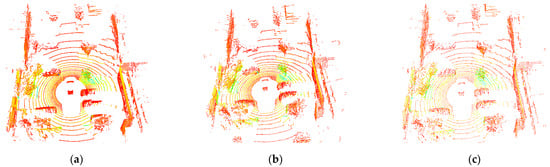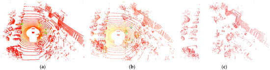 Figure 10a is a frame of raw radar data captured in RVIZ, including vehicles, pedestrians, trees, and buildings, where the concentric circles represent the ground points. Figure 10b is the point cloud image obtained after filtering the original point cloud. The number of point clouds is obviously reduced, but the useful information of the point cloud is basically retained, which can reduce the amount of calculation of data processing and improve the real-time performance of the system. Figure 10c is a frame of obstacle point cloud image obtained after dividing the ground by using the Ray Ground Filter algorithm. The number of point clouds is further reduced, and the ground points are completely removed. After the above point cloud filtering and ground segmentation operations, a frame of valid point cloud data is obtained, and on this basis, the subsequent point cloud clustering and target tracking process are more accurate.