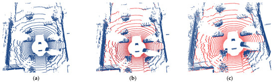 Ground segmentation results: (a) original point cloud, (b) RANSAC algorithm, and (c) proposed method.