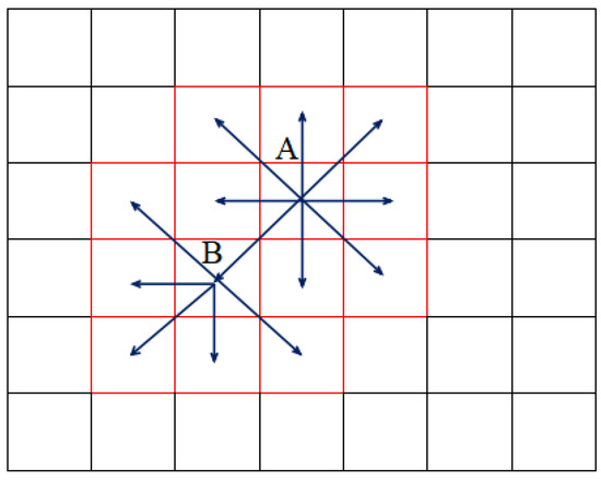 (2) Conduct 8-neighborhood expansion clustering. As shown in Figure 7, the 8-neighborhood searches are carried out counterclockwise, with point A of the seed grid as the center. After visiting the surrounding grids, the next grid point, B, is used as a new seed grid, and the 8-neighborhood searches continue until all grids have been visited and a single obstacle is detected. Repeat the above steps for the remaining unvisited grids to complete the detection of all obstacles.