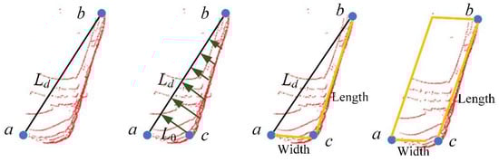 First, select the outliers, a and b, that are farthest from both sides of the obstacle boundary facing the radar. Then connect points a and b to obtain line segment, Ld (all points in the obstacle make an orthogonal line to Ld), and use the iterative endpoint fitting algorithm to find the line segment with the largest distance and the angle close to verticality as L0. Finally, let the corner point where L0 does not intersect with Ld becomes c and connect the three points, a, b, and c, to get an L-shaped polyline, as the line segment bc shown in Figure 8. Since the heading of most vehicles is parallel to the longest side of the boundary, the heading of the bounding box is the longest line segment. This method requires enough data points and is mainly designed for obstacles in the shape of a cuboid. Therefore, compared with smaller obstacles, such as bicycles and pedestrians, it is more suitable for automobile obstacles and can also deal with the case of occlusion.
