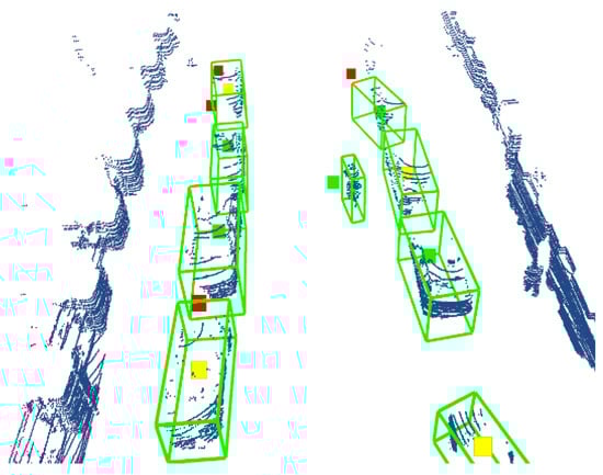 After the heading of the obstacle and the 2D bounding box are determined by the above L-shaped fitting, the height of the 3D bounding box is determined by the maximum height difference in the obstacle point cloud. In combination with height, the rectangular box generated by this method is shown in Figure 9. It is obvious from the figure that 3D bounding boxes of the vehicles on both sides of the road are well fitted.