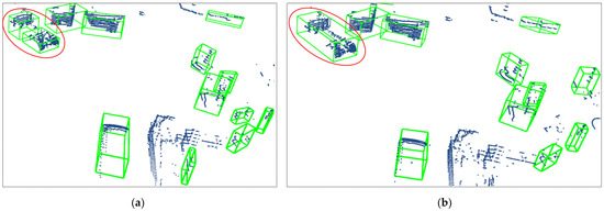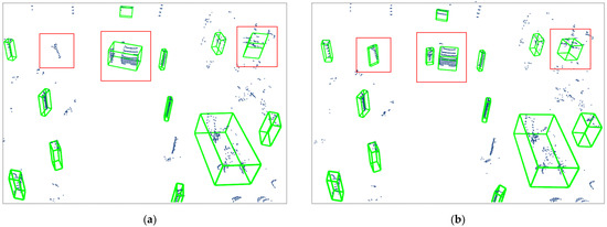Comparison of point cloud clustering results of obstacles near intelligent vehicles: (a) traditional DBSCAN algorithm and (b) the improved method proposed.