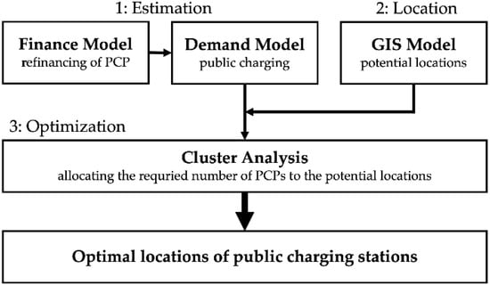 To support effective development on a municipal level, this study investigates the public charging demand and the infrastructural supply empirically and geo-spatially to determine the optimal volume and locations of public charging stations. The presented modeling approach is then applied to the city of Bottrop in North Rhine-Westphalia, Germany, as a case study. As illustrated in Figure 1, the methodology consists of three primary steps: estimation, location, and optimization.