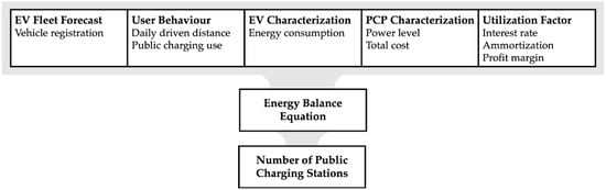In order to estimate the required number of public charging stations, an approach proposed by Philip and Wiederer [22] and extended by Wirges et al. [8] was adopted in this part. This approach is built upon an energy balance formula combined with a finance model for refinancing public charging stations, as shown in Figure 2.