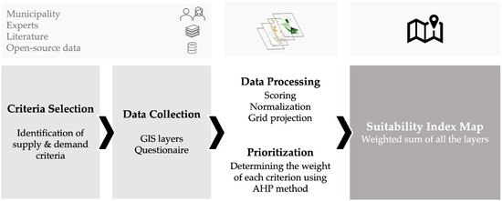 The geospatial analysis was conducted on QGIS which is an open-source geographic information system (GIS) software used for processing and visualizing geodata [23]. In this study, part of the vector-based datasets were provided by the municipality of Bottrop, while the other part was obtained from OpenStreetMap [24] which is an open-source database. Further details to the used dataset are explained in the Section 4 case study. Figure 3 presents all steps performed in the geospatial analysis.