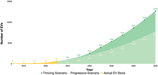 The parameters (number of electric vehicles) and (share of public charging) are difficult to obtain from the current data. Since there is no certainty in projecting the evolution of EV fleet, as well as the percentage of charging taking place at public charging stations, four scenarios were developed for the year 2030 considering the EV adoption rate and the share of public charging. The size of the EV fleet in 2030 was estimated from two projections, namely a realistic one (progressive scenario) and an optimistic one (thriving scenario). The first is based on the polynomial regression of historical data of electric passenger vehicle registration provided by the German Federal Motor Transport Authority between 2017 and 2021 in Bottrop [31]. While the second relies on the German federal government ambitious goal of 10 million electric vehicle by 2030. Out of it, it is estimated that 9 million electric vehicles will belong to the passenger segment. The yearly developments of the EV stock in Germany to reach this target was modeled by the German Energy Agency [32]. Since this projection is for Germany, the EV per capita ratio was derived for each year using its population in 2020 as a base year [33]. The yearly ratios were then applied to the population of Bottrop taken on the same base year [34]. As a result, Figure 4 exhibits the development of the EV stock in Bottrop until 2030.