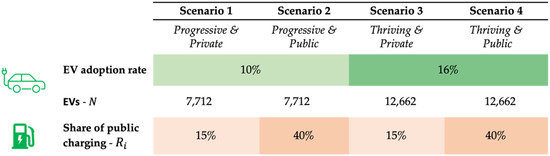 For comparability, the total passenger vehicle stock in Bottrop was linearly projected from the vehicle registration history provided by the German Federal Motor Transport Authority between 2017 and 2021 to derive the EV adoption rate by 2030 [31]. Building on the forecast of the German federal government master plan for charging infrastructure, the ratios of non-public (home and work) to public charging will range from 60% to 40% and 85% to 15% respectively [35]. Consequently, the scenarios in Figure 5 are constructed: