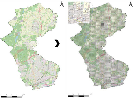 First, the datasets of the 16 criteria were examined in the form of GIS layers. Data cleaning was then performed to remove incomplete, duplicate, or irrelevant data from supply and demand dimensions. To protect confidential information, only the processed data are presented. Next, a base layer is created where the study area is divided into a 100 × 100 m hexagon-grid (vertical and horizontal spacing). This transformation was conducted to enable the evaluation of the potential of EV charging infrastructure in each cell within the total area of Bottrop as illustrated in Figure 6. The size of the hexagon cell was determined on the account of providing a meaningful and conclusive location evaluation while maintaining its applicability for the different dataset resolutions. After that, the data values of each criterion were projected to the corresponding cells either by their sum or average, depending on the layer type (which are described in the section below).