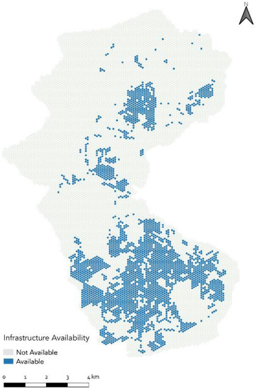 For supply criteria, public space availability and proximity to electric grid connections are critical considerations for locating charging stations. In addition, several preferences highlighted by the municipality—such as clearance from trees and closeness to streetlight posts—were considered. Thus, a spatial analysis is carried out for these GIS layers by buffering, intersecting, and excluding the supply criteria layers using the Euclidean distance method. The resulting layers are first joined and then projected to a base grid layer that mirrors the infrastructural availability in each cell. Wherever there is an availability, the cell is given a value of one, whereas its absence is zero.