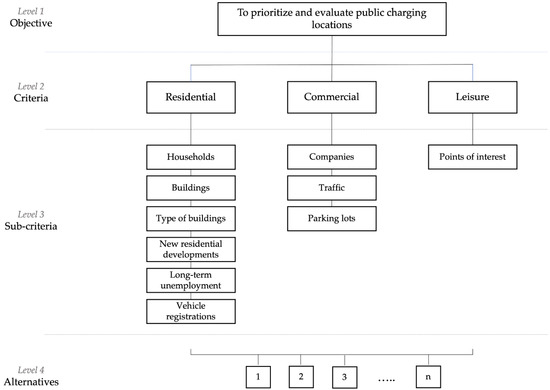 The selection of this method was based on its subjectivity and ability to reflect the decision maker’s preferences. Since the development of the charging infrastructure depends on the municipality’s strategy, specifically if they intend to prioritize public charging for one demand dimension over the other (e.g., residents), this method serves the needs.