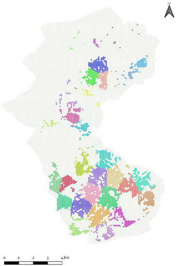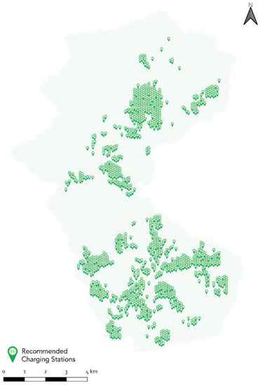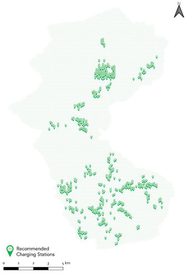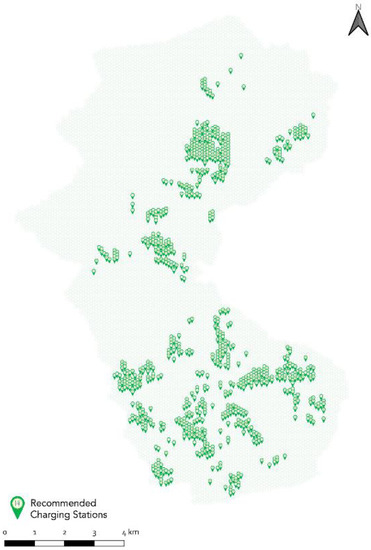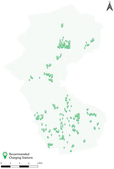 After running the k-means clustering algorithm, the suitability index map was classified into 30 clusters. The average scoring of each cluster was calculated and weighed against the total sum of average scores of all clusters. Each cluster was then assigned a share of the total proposed public charging stations in each scenario (see Table 8). Once the share for each cluster is obtained, the charging stations were assigned on a one-to-one basis to the top-ranking cells of each cluster. Only in Scenario 4, which is marked by the highest number of charging stations, three clusters were saturated as their share of allocated charging stations exceeded the number of cells they contain. In this case, a second iteration was made on the top-ranking cells where a second charging station was assigned in addition to the first one until the total share is completely attained. Figure 13, Figure 14, Figure 15 and Figure 16 show the final layout for each scenario after the optimization step. The charging stations are located at the center of every cell. Knowing that each cell fulfills all the constraints set in the supply dimension, a site visit and an assessment of the electric connection points capacity are needed to precisely locate and build the charging stations in their corresponding cells.