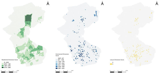 The residential dimension scores show a wider distribution across rural and suburban areas of the city with higher values concentrated particularly in the northern part due to its residential nature. The commercial dimension scores are dispersed across the city and concentrated in the southern part as it revolves around the city’s commercial center and suburban areas. A similar pattern can also be noticed for the leisure dimension. Since this dimension has only one sub-criterion, the weighted score is equivalent to the total sub-criterion score. As mentioned in the case study section, the scoring of the points of interest criterion is based only on the availability of POIs which is mirrored in its scoring range.