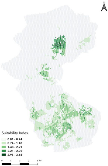 Considering the weights of each dimension, the weighted sum of scores of the three dimensions yields to the final total scores. Combined with the supply constraints depicted by the infrastructural supply layer, the suitability index map is produced as shown in Figure 12. As deduced from the mobility manager’s input, the highest preference was given to the residential dimension, leading to higher scores particularly in areas that overlap with the residential dimension map; notably, in the northern part of the city. This highlights the significance of the cluster analysis conducted in the next step to ensure a wide geographical distribution whilst giving precedence to the cluster’s top-scoring cells.