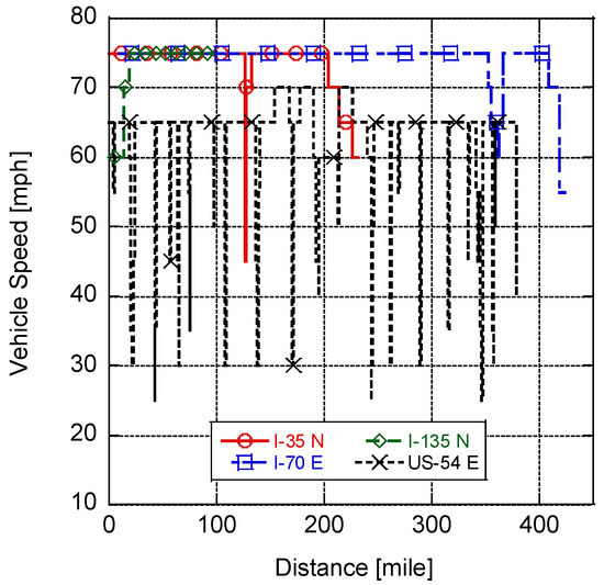 Given this wide variance in energy usage and corresponding EV range, it is important for local municipalities and state agencies to have a simulation tool that can estimate the range of commercial EVs in their local environment. This can then be used to help the process planning of effective charging station infrastructure. While extensive models exist for motors, batteries, air conditioning, and other aspects of EVs, this effort endeavors to generate a simple overarching model that includes all necessary variables to estimate the range of EVs on local roads based on the time of year. Six commercial EVs, with their parameters provided in Table A1, were calibrated to their EPA-stated range as per the SAE J1634 test method. Parametric studies were completed to understand the various aspects that influence range over the following Kansas roads: I-70, I-35, US-54, and I-135. The interstate roads were chosen since they are the primary corridors through Kansas where EV charging stations are planned. A relatively lower-speed highway was selected for comparative purposes, and vehicle speed as a function of distance is shown in Figure 1 for one direction of these routes. In addition, the model was employed to predict the range of an EV that is not commercially available yet as an exercise to understand how the real range of the vehicle in Kansas compares to the EPA-stated range. The subsequent sections of this work include a description of the model developed, followed by a summary of the resulting parametric studies.