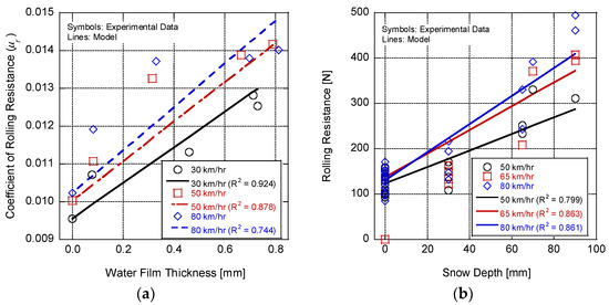 Comparison of rolling resistance model predictions and experimental data for (a) rain and (b) snow.