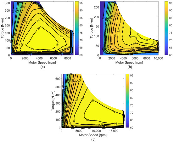 Digitized motor efficiency maps for (a) permanent magnet synchronous motor A, (b) permanent magnet synchronous motor B, and (c) induction motor. Near the origin and out of the maximum power area, a few values were estimated due to limits of the digitization process. Contour lines are indicated at 60%, 70%, 80%, 82%, 84%, 86%, 88%, 90%, 91%, 92%, 93%, 94%, 95%, and 96% efficiency values.