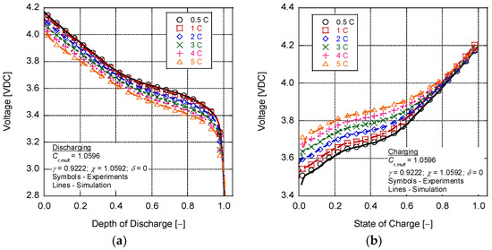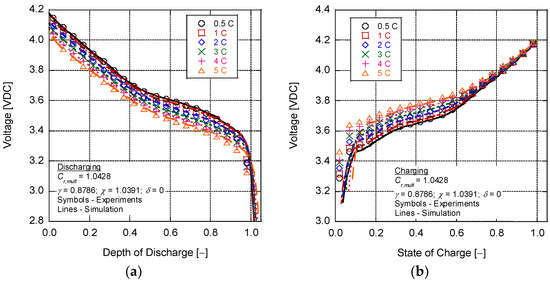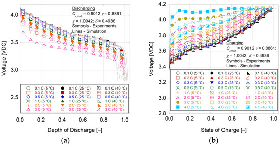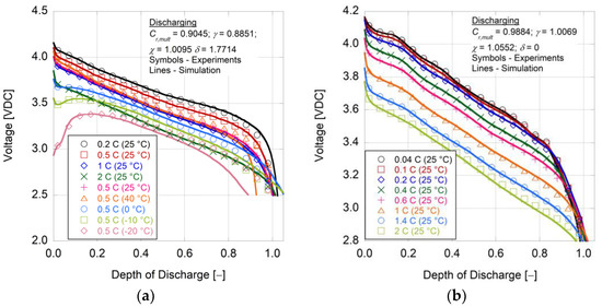 The calibration of the capacity offset parameters in Equation (37) follows the efforts of O’Malley et al. [48]. This model employs an absolute capacity parameter (Ah0) that (a) replaces the arbitrariness of 20 h rate nominal capacity values, (b) includes the fact that batteries experiencing high discharge rates have remaining capacity if the discharge rate is decreased, and (c) allows for simple integration of battery aging through the degradation of the absolute capacity. The model results in Figure 4 through Figure 7 show good accuracy for all batteries, as the model is able to dynamically adjust to different currents with the absolute capacity term (equal to Cr,mult times the nominal capacity) and parameter γ, helping to equate the energy potential to the discharge rate. The current capacity offset factor responds to the effective energy change and modifies the overall slope of the curve, whereas δ factors in the additional loss of capacity (or gain) as the temperature decreases (or increases). Model fidelity falters near 100% depth of discharge and at relatively low temperatures; however, these conditions should be rarely encountered by battery packs in EVs.
