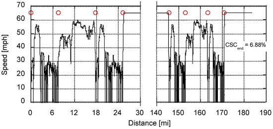 Two further considerations are needed regarding the SAE J1634 standard: (1) the vehicle must be aged at least 1000 miles, and (2) the Constant Speed Cycle (CSC) at the end of the MCT must be 20% or less of the total driving distance. Regarding aging, it states that battery aging may be performed either with the vehicle [54] or by using an equivalent bench test procedure [55]. Since it was not readily apparent how to translate the bench test procedure to vehicle miles, the methodology to age the vehicle using the durability driving schedule (UDDS) was employed [54]. The UDDS cycle was simulated for 1000 miles to determine the respective number of cycles () the battery pack underwent. Then, the capacity-remaining polynomials in Section 2.6 were used to determine the respective value of to be applied to the pack prior to simulating the SAE J1634 standard.