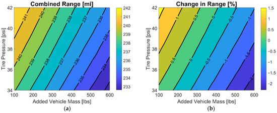 Other significant impacts on EV range are the rolling resistance and aerodynamic drag. At low speeds, when road grade is negligible, rolling resistance and drag make up the total forces acting on the vehicle that must be overcome [13]. While the EPA test does include a joint factor for both components, the impact of wind speed and direction on drag is not considered [14,15]. In addition, the increased rolling resistance due to underinflated tires can lead to EV range losses of a few percent [16]. Weather can also play a substantial role in rolling resistance, as rain can increase this resistance by up to 10% [17]. Analogously, snow can increase rolling resistance by 6–9%, depending on whether it is old or freshly fallen [18]. Thus, researchers should incorporate these effects into their models [19].