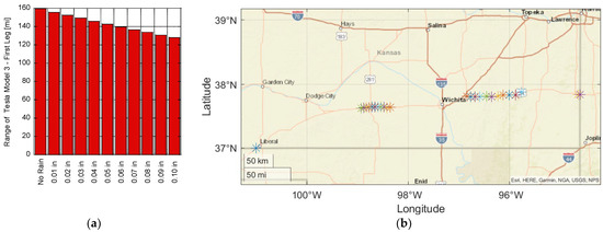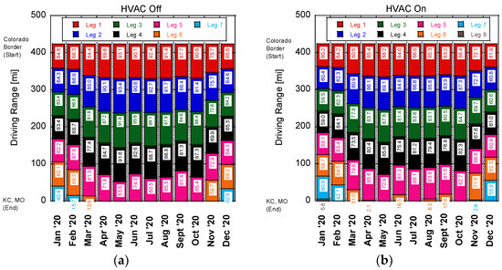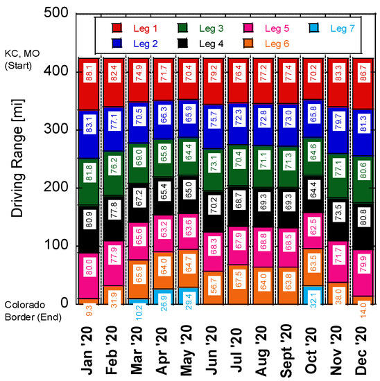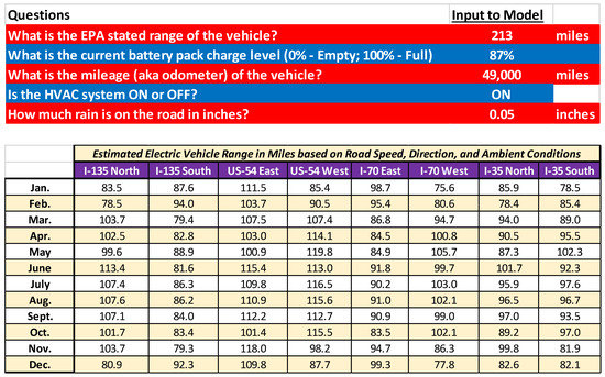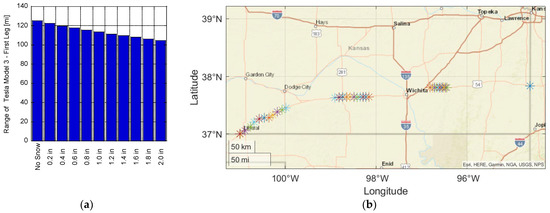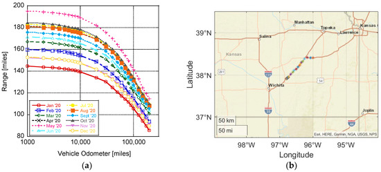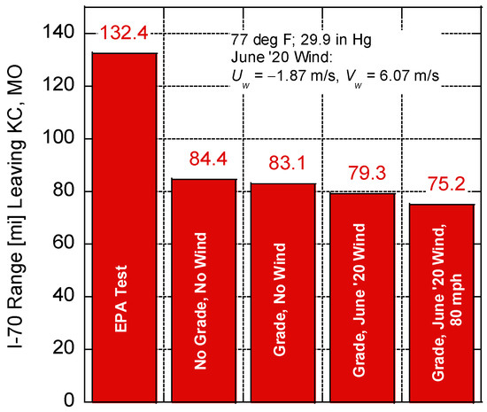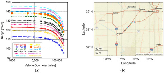 While battery technology has improved significantly over the last decade, range anxiety is still a primary consideration for consumers when contemplating the purchase of an electric vehicle (EV) [1]. A recent survey by Autolist found that EV range tops consumers’ list of priorities [2], with one of their earlier surveys indicating that the majority of respondents considered 300 miles of range to be sufficient [3]. While most commercially available EVs are now able to achieve greater than a 200-mile range, with the Tesla Model 3 sporting a 353-mile range according to the Environmental Protection Agency (EPA), the actual on-road range of EVs must overcome a variety of factors (e.g., weather, weight, road grade, and cabin conditioning). This distance can be significantly different than the ideal conditions employed by the EPA during the Society of Automotive Engineers (SAE) J1634 test at 77 °F using a chassis dynamometer with the cabin conditioning system turned off [4]. Driving conditions and individual drivers can also experience dissimilar ranges, with Hu et al. finding a 15.6% higher energy consumption during congested traffic conditions and up to 32.4% and 30.0% in energy consumption between drivers during peak hours and off-peak times, respectively [5]. Hao et al. similarly found that the energy consumption of EVs exceeds New European Driving Cycle (NEDC) test conditions by 7–10%, along with significant losses in winter, with EVs only achieving 64% of the expected NEDC range [6]. Thus, the varying range experienced by EV drivers can be problematic when designing a charging infrastructure to handle their range anxiety while considering the travel route and weather conditions [7]. This is especially true in Kansas when considering the wide range of conditions encountered. Kansas is the second windiest state in the union [8] and encounters all four seasons with potentially significant rainfall and snow levels [9].