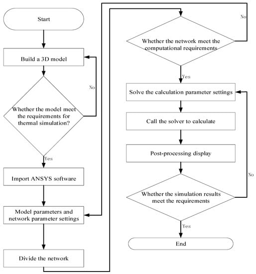 Figure 1 is a schematic diagram of the wireless charging system for electric vehicles. As can be seen in Figure 1, the transmitter device is placed below the ground, which makes it difficult to dissipate heat due to poor air circulation, which can easily lead to heat accumulation, temperature rise, damage to the device, and difficulty in maintenance. The receiving coil is installed in the lower part of the vehicle, which requires waterproof, dustproof, and other encapsulation protection treatments, leading to difficulties in its heat dissipation and, therefore, requiring thermal analysis and design to ensure its operational reliability. The transmitting coil and receiving coil are the main components of the electric vehicle radio energy transmission system. The transmitter coil generates an alternating magnetic field under the action of an alternating current, and the receiver coil generates an induced electric potential under the action of the magnetic field for energy transmission. To simulate the electric vehicle radio energy transmission system, it is necessary to first simplify the radio energy transmission system, combine the simulation features of the ANSYS software platform, and transform it into a thermal model that can be solved computationally while keeping the basic structure and state unchanged. There are two methods of building the thermal model: one is to use the component module that comes with the ANSYS software for modeling, and the second is to use an external CAD model import. In this study, we used the software’s component module for modeling. When using Icepak for thermal simulation, geometric features that do not affect heat dissipation need to be deleted during the model import process, while geometries that are not suitable for the software for thermal simulation must be modified and simplified. The model was imported into ANSYS through the Geometry module and modeled and analyzed in the ANSYS software platform. The flowchart of the thermal analysis performed in this study is shown in Figure 2.