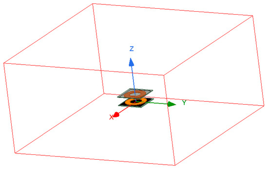 Table 1 mainly sets up the calculation area of the coil model and sets up the calculation side lengths for the six directions of the X-, Y-, and Z-axes. According to the requirements of the software for setting the thermal stability model, the upper distance of the model (the opposite direction of gravity) should be at least 2 L, the minimum value on the left and right sides should be 0.5 L, and the distance in the direction of gravity should be at least 1 L. In this example, the receiving coil was installed on the car, and the space was limited, so the X-axis, Y-axis positive and negative directions, Z-axis negative direction 3 L, and +Z direction 6 L were set. Figure 3 shows a diagram of the model after setting up the calculation area. The red bounding box range is the calculation area for the visualization effect. The orange part of the figure is the coil, and the black part of the figure is the core layer, which is divided into two parts, namely the transmitting coil and the receiving coil. In the receiving part, the receiving coil was very clear due to the transparency parameter of 0.5.