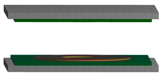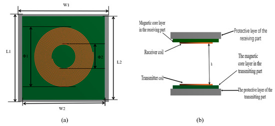 Figure 6a shows the top view of the coil model, in which the maroon circle is the coil, which is made of copper. The green square in the figure is the core layer and is partially covered by the circle, where the outermost gray area is the protective layer, made of Bakelite. The parameters of the coil model were set accordingly by reviewing the literature and considering the very limited installation space in the car. The coil had a length, , of 220 mm, a width, , of 210 mm, an inner diameter, , of 100 mm, and an outer diameter, , of 181 mm. Figure 6b shows the side view, divided into two parts—the upper and lower parts—with a distance of 60 mm. The upper part was placed on top of the electric car body and the lower part was mounted on the ground for energy supply. The yellow color represents the coil, the green color represents the core layer, and the remaining gray part was used to protect the wireless charging system from dust and water.