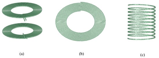 The model built in this study was for the simulation and analysis of the power transmission system of a coupled resonant wireless charging car. The appearance of the model is shown in Figure 5. The coil material in the model is copper wire, and the material of the external protection shield is made of aluminum metal. In Figure 5a, the inner radius of the coil is 50 mm, the growth radius is 4.05 mm, the number of turns of the coil is 10, the transmitting and receiving coils are equal, the offset distance is 0 mm, and the relative distance between the two coils is 60 mm. In Figure 5c, the cylindrical spiral coil has 10 turns with a wire cross-section of 2.05 mm × 2.05 mm and an initial radius of 50 mm.
