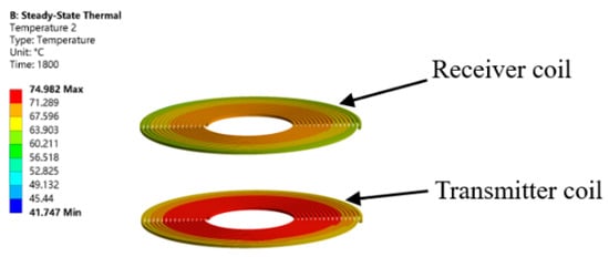 When the coil is made of copper and works for 30 min, the highest temperature in the system is the transmitting coil, and its maximum temperature is 74.982 °C, which is in line with the normal charging temperature of wireless electric vehicles. According to the general design requirements, the civil grade working temperature range is 0–90 °C, the material is selected from domestic grade original parts, the process treatment is waterproof, and the circuit board is integrated. The military-grade working temperature range is −55–125 °C, possesses auxiliary circuit and backup circuit design, shock resistance, high-temperature resistance, and multiple protections. The coil temperature studied in this research was within its normal range, and the transmission efficiency was high from the perspective of thermal simulation.