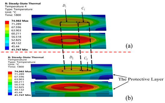 Figure 9 shows the temperature cloud diagram, divided into two parts, upper and lower, with the red dashed line in the diagram as the dividing line. Figure 9a is composed of the coil and the core layer. Figure 9b is made by adding a protective layer on top of the upper part.