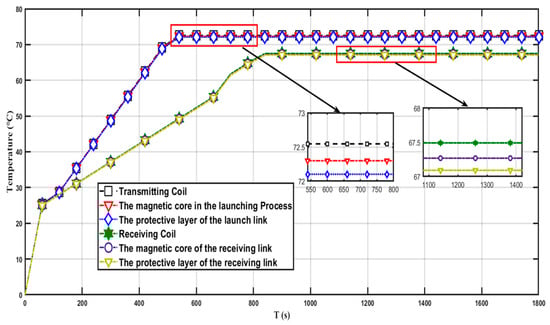 Figure 10 shows the temperature profile of the coil model with bakelite as the protective layer, aluminum as the coil, and copper as the core. As a whole, the temperature of the transmitting part of the model is higher than that of the receiving part. Between 0 and 500 s, the temperature of the transmitting part appears to increase sharply and then smoothly as time increases. In the time from 500 to 1800 s, the temperature of the transmitting part tends to a value that is stable and constant around 72.5 °C. The temperature difference of the transmitting part, which consists of the protective layer, the core layer, and the transmitting coil layer, is relatively small from the local magnification on the figure, and the difference is not more than 0.5 °C for these three layers. The temperature of the receiving part increases between 0 and 900 s with increasing time, and the temperature rises quickly and then slowly. The temperature of the receiving part no longer changes significantly from 900 to 1800 s but is stable at around 68 °C. The local plot in the figure shows that the maximum temperature of the transmitting coil is around 72.5 °C and the maximum temperature of the receiving coil is 67.5 °C.