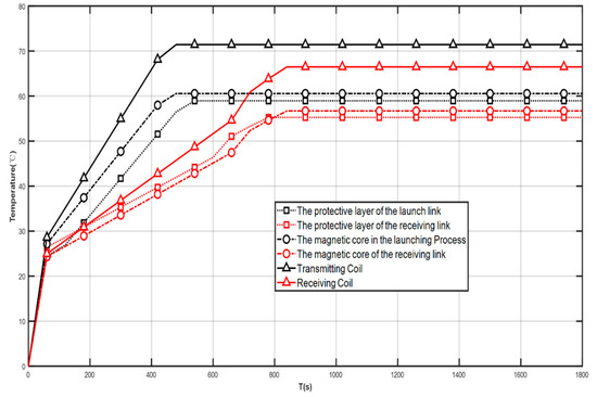 The temperature of the protective layer, core layer, and receiving coil layer in the receiving section increased with time from 0 to 840 s. In the range of time values of more than 840 s and less than 1800 s, the temperature of each layer in the receiving section no longer changed significantly, and the maximum temperature of the receiving coil was 66.5 °C. The maximum temperature of the core layer in the receiving section is 56.7 °C, and the temperature of the protective layer is 55.25 °C. The maximum value is 55.25 °C.
