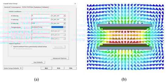 The airflow velocity parameters between the transmitting and receiving sections are set, and the state and velocity distribution of the external fluid flow are shown in Figure 13. Figure 13a shows the setting of the wind speed. Figure 13b shows the effect on the velocity coil model, in which the red color indicates the maximum value and the blue color indicates the minimum value. The air inside the coil flows upward as a whole, and the flow velocity is higher in the lower part, and the maximum velocity occurs between the transmitting and receiving coils, with a maximum velocity of 0.52 m/s. Significantly, the highest rate is consistent with the highest temperature, and the rate is also smaller in the area below where the heat flow density is smaller; thus, the reliability of the experiment and the correctness of the theory is verified.