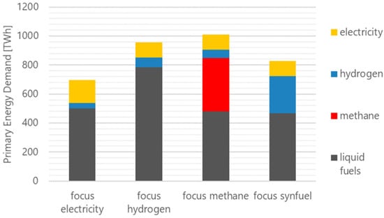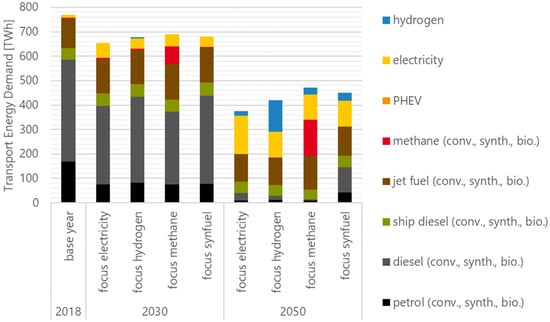 Assuming that no biofuels are available for transport since they are needed in other sectors for a complete decarbonization, all fuels would have to be produced from electricity by 2050. If this was the case, the electricity demand for transport would be as shown in Figure 4. We can clearly observe that a large electrification would cause the lowest electricity demand for transport (~700 TWh) compared with the synfuels-focused or methane-focused scenario (~1000 TWh). However, the large shares of liquid or gaseous fuels in all scenarios showed the increasing importance of the aviation and navigation sectors that are not expected to be largely electrified by 2050.