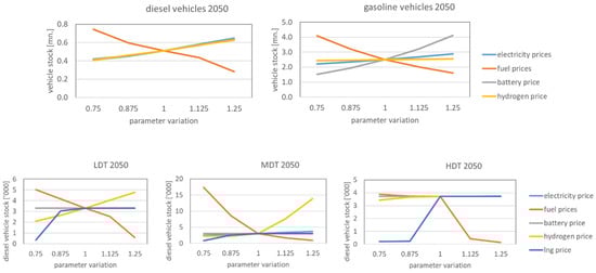 Sensitivities on conventional vehicle stock in 2050 in the electricity-focused scenario for changes in energy prices. Variation of energy prices by −25% to +25% shown on the x-axis and respective results for diesel or gasoline passenger cars (upper panel) and diesel vehicles in LDT, MDT, and HDT (lower panel). Changes for electricity price (blue), fuel (gasoline + diesel) prices (orange), battery price (gray), hydrogen price (yellow), and LNG price for trucks (dark blue).